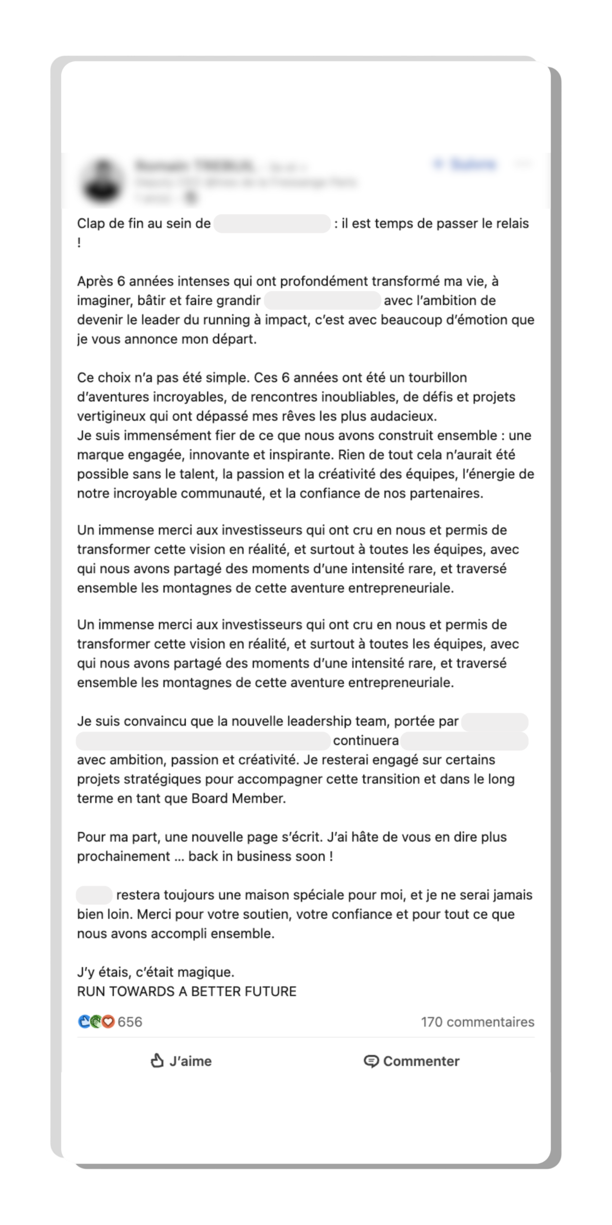 Le CEO d'une marque est aussi son fondateur. Il va désormais quitter l'entreprise. Comment trouver les bons mots ? Le ton juste, pour informer la communauté ?