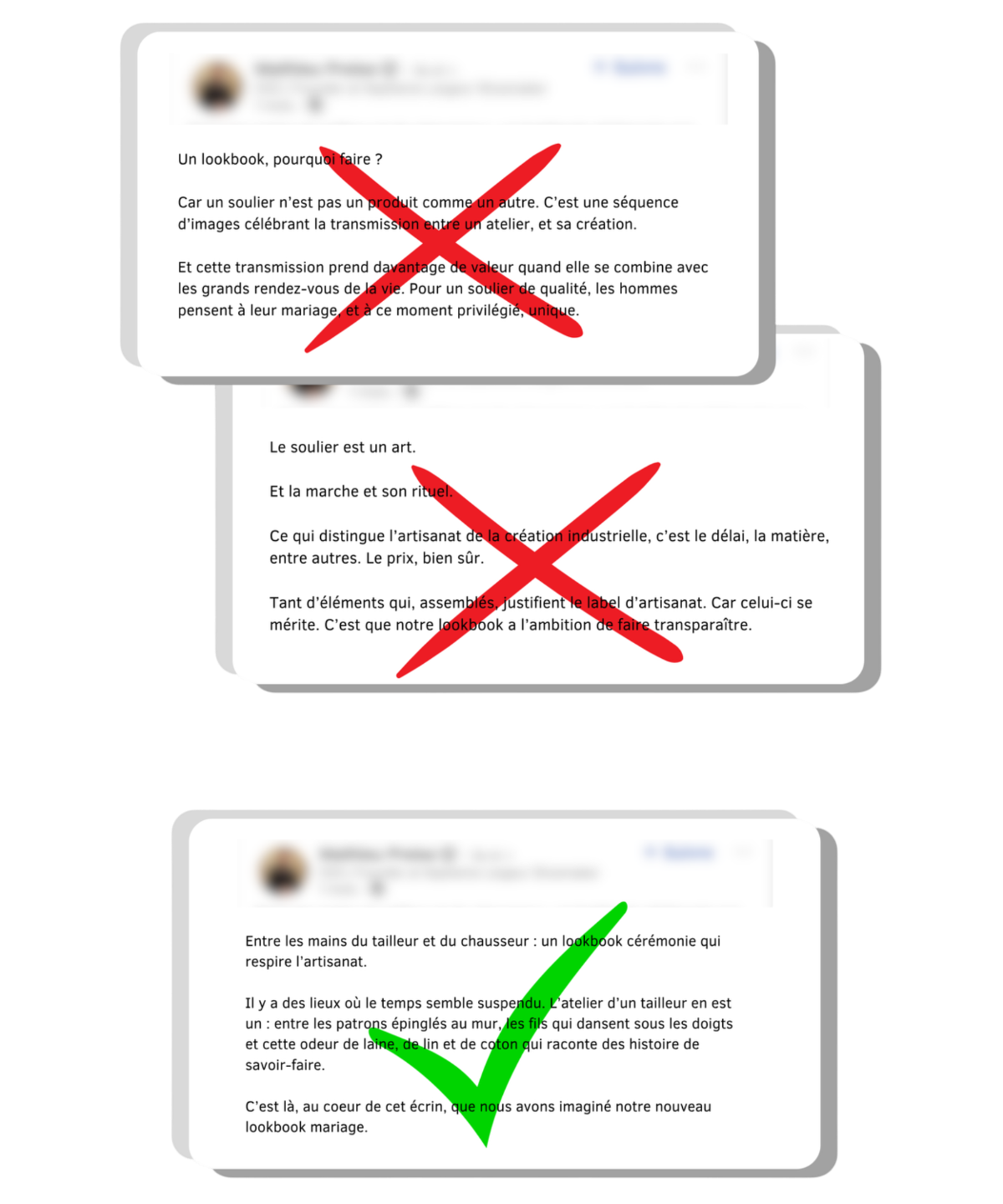 Le CEO/Founder veut valoriser la part d'artisanat de sa marque, pour introduire un nouveau lookbook. Le risque : tomber dans le lyrisme et perdre la communauté avec des effets littéraires sans profondeur.