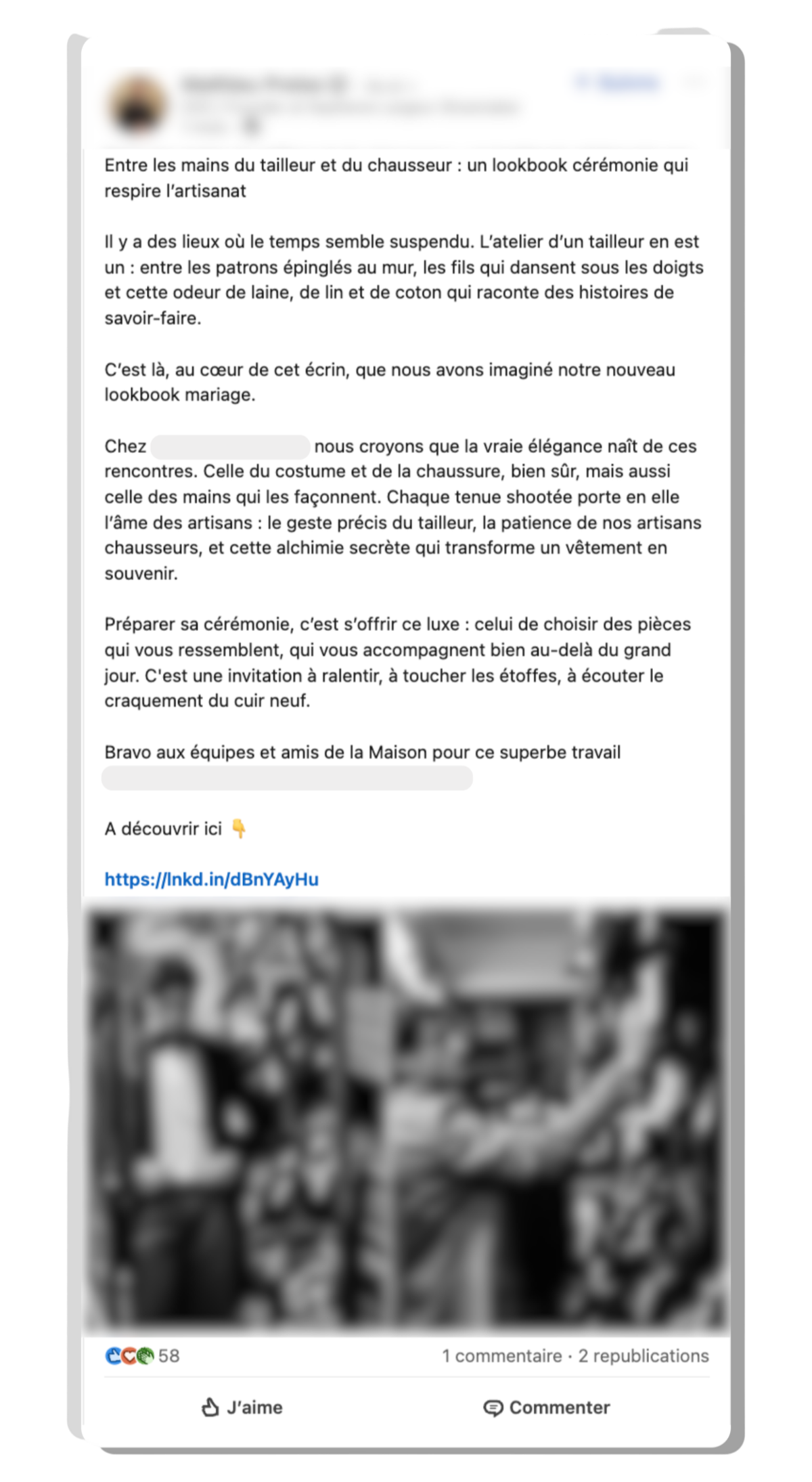 Le CEO/Founder veut valoriser la part d'artisanat de sa marque, pour introduire un nouveau lookbook. Le risque : tomber dans le lyrisme et perdre la communauté avec des effets littéraires sans profondeur.